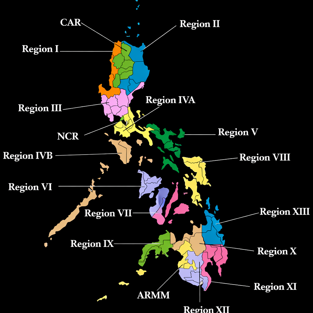 BARMM Basilan Lanao del Sur Sulu Maguindanao Tawi-Tawi CAR Abra Apayao Ifugao Kalinga Mountain Province MIMAROPA Marinduque Occidental Mindoro Oriental Mindoro Palawan Romblon REGION I Ilocos Norte Ilocos Sur La Union Pangasinan REGION II Batanes Cagayan Isabela Nueva Vizcaya Quirino REGION III Aurora Bataan Bulacan Nueva Ecija Pampanga Tarlac Zambales REGION IV-A Batangas Cavite Laguna Quezon Rizal REGION V Albay Camarines Norte Camarines Sur Catanduanes Masbate Sorsogon REGION VI Aklan Antique Capiz Guimaras Iloilo Negros Occidental REGION VII Bohol Cebu Negros Oriental Siquijor REGION VIII Biliran Eastern Samar Leyte Northern Samar Samar Southern Leyte REGION IX Zamboanga del Norte Zamboanga del Sur Zamboanga Sigubay REGION X Bukidnon Camiguin Lanao del Norte Misamis Occidental Misamis Oriental REGION XI Davao del Norte Davao del Sur Davao Occidental Davao Oriental REGION XII Cotabato Sarangani South Cotabato Sultan Kudarat REGION XIII Agusan del Norte Agusan del Sur Dinagat Islands Surigao del Norte Surigao del Sur